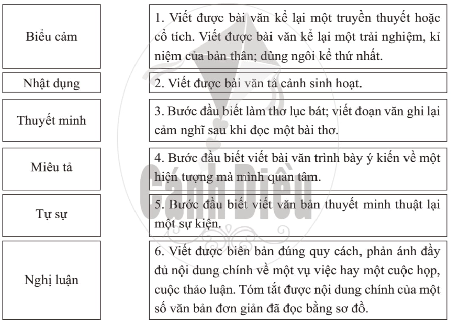 Xác định tên các kiểu văn bản (Phần II. Học viết trong SGK) và yêu cầu cơ bản của mỗi kiểu văn bản tương ứng được rèn luyện viết ở SGK Ngữ văn 6.