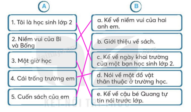 Nối tên bài đọc tương ứng với nội dung của nó. Đọc lại những bài đọc trên. Viết từ ngữ gọi tên đồ vật vào chỗ trống. Viết tên đồ vật dưới hình. Viết 2 câu nêu công dụng của 2 đồ vật. Nối các từ ngữ để tạo câu nêu đặc điểm. Nối câu ở cột A với kiểu câu phù hợp ở cột B. Điền dấu chấm hoặc dấu chấm hỏi vào ô trống. Chọn kể một câu chuyện mà em yêu thích.