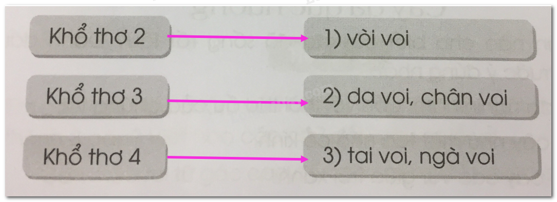 a. Mỗi khổ thơ nói về những bộ phận nào của con voi? Nối đúng: