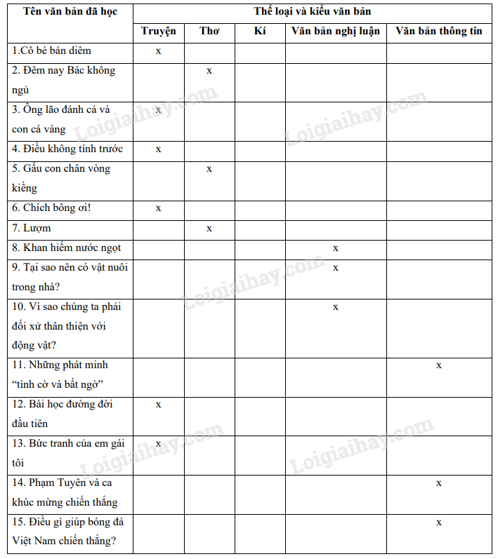 Điền các tên văn bản ở câu 1 vào bảng sau cho phù hợp với các tiêu loại và kiểu văn bản ở cột bên trái.