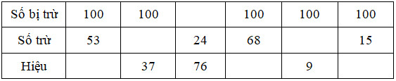 a) Trong một phép trừ, biết số bị trừ là 100 và hiệu là 0. Số trừ trong phép trừ đó là : …