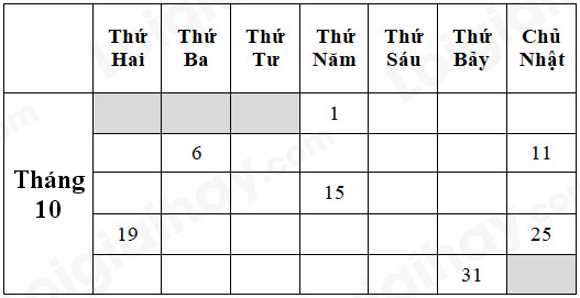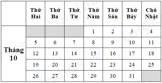 Bài 4. Viết tiếp các ngày còn thiếu trong tờ lịch tháng 10 năm 2020 :