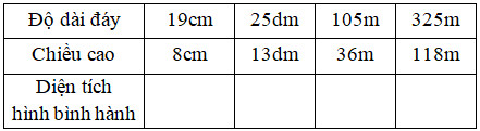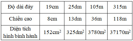 Muốn tính diện tích hình bình hành ta lấy độ dài đáy nhân với chiều cao (cùng một đơn vị đo).