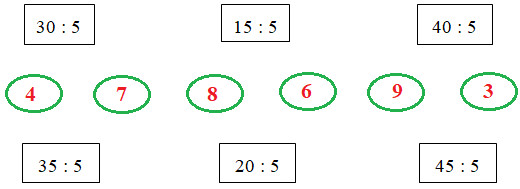 Nhẩm lại bảng chia 5 để tìm kết quả của mỗi phép chia, sau đó nối phép tính với kết quả của phép tính đó.