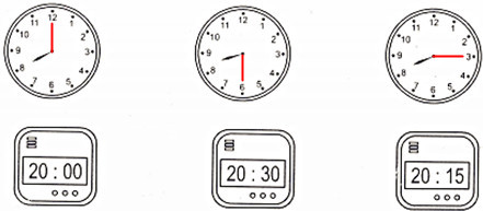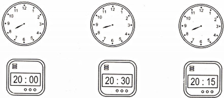 Câu 3. Vẽ thêm kim phút vào mỗi đồng hồ để có giờ ứng với đồng hồ điện tử: