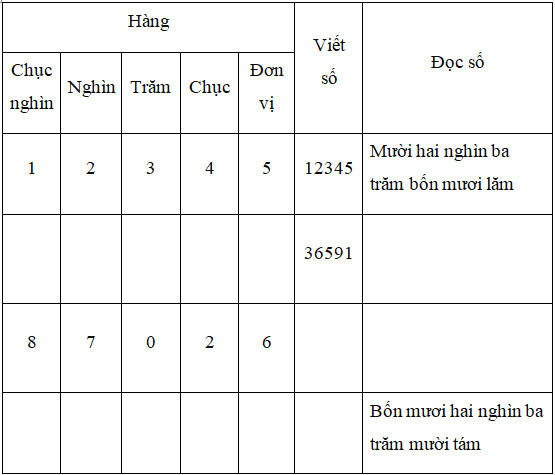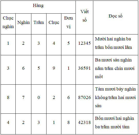 – Các chữ số từ phải sang trái lần lượt thuộc hàng đơn vị, hàng chục, hàng trăm, hàng nghìn, hàng chục nghìn.