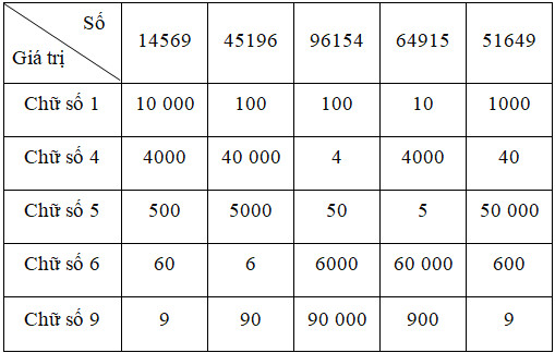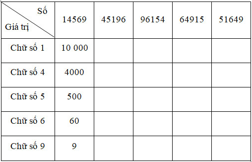 Bài 2. Điền giá trị của chữ số vào bảng sau (theo mẫu)