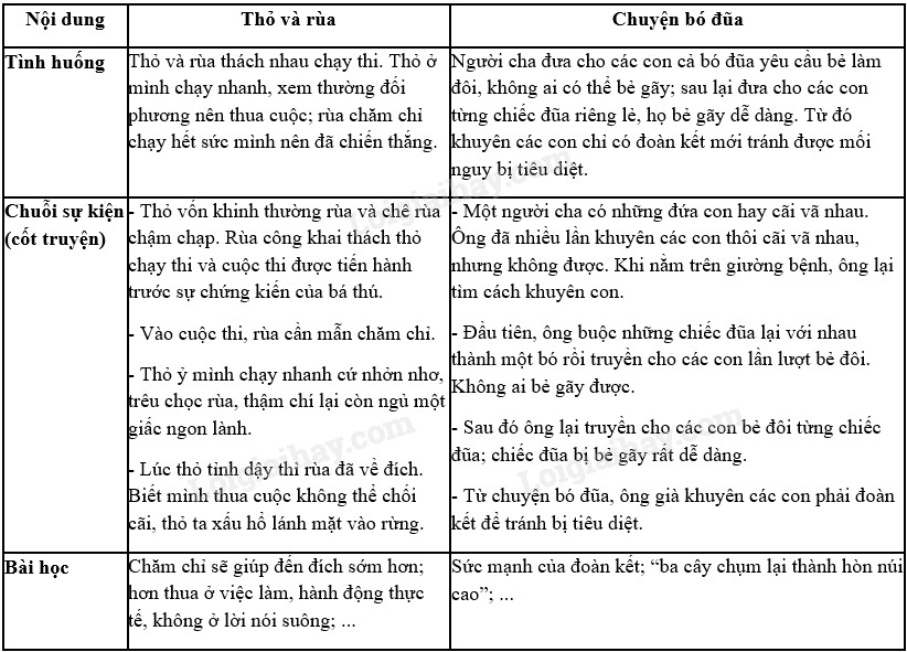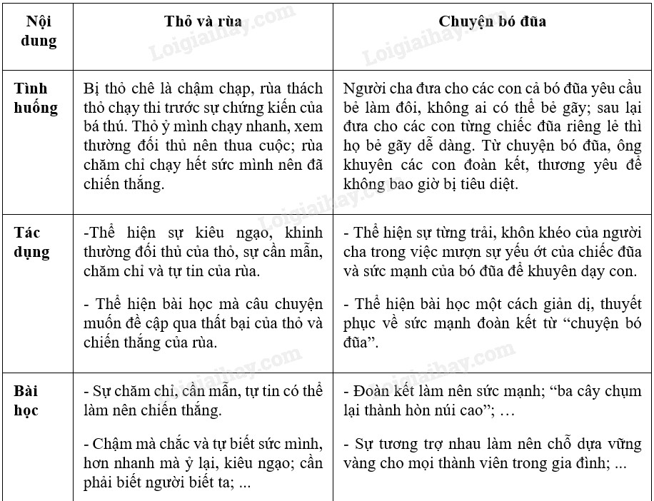 – Tình huống, tác dụng, bài học trong Chuyện bó đũa có thể tóm tắt trong sự đối chiếu với các yếu tố này trong truyện Thỏ và rùa qua bảng sau:
