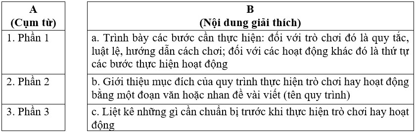 Nối thông tin (cột A) với thông tin tương ứng (cột B) để xác định cấu trúc của văn bản thông tin giới thiệu một quy tắc hoặc luật lệ trong trò chơi hay hoạt động.