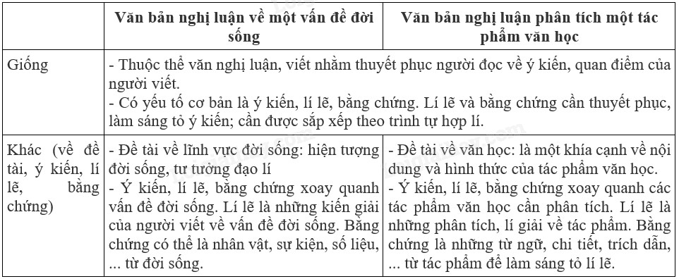 Dựa vào bảng sau em hãy nêu điểm giống và khác nhau giữa văn bản nghị luận về một vấn đề đời sống và văn bản nghị luận phân tích một tác phẩm văn học: