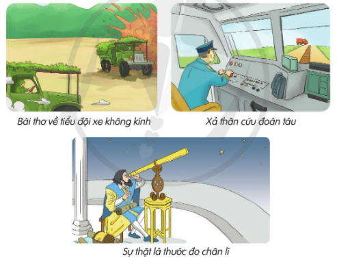 HS cùng quan sát các hình ảnh trực quan sau đó đọc tên các bài thơ, câu chuyện để phân biệt các hành động dũng cảm.
