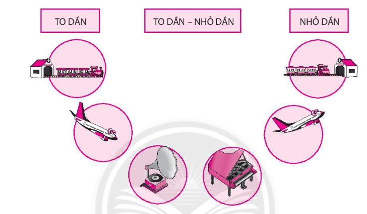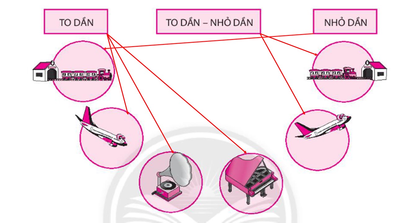 Em hãy nối các sự vật tạo ra âm thanh to dần, to dần – nhỏ dần và nhỏ dần trong các hình sau vào ô chữ thích hợp