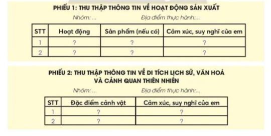 Chuẩn bị: Lựa chọn một địa điểm để thực hành quan sát: nơi diễn ra hoạt động Sản xuất hoặc di tích lịch sử, văn hoá, cảnh quan thiên nhiên ở địa phương.
