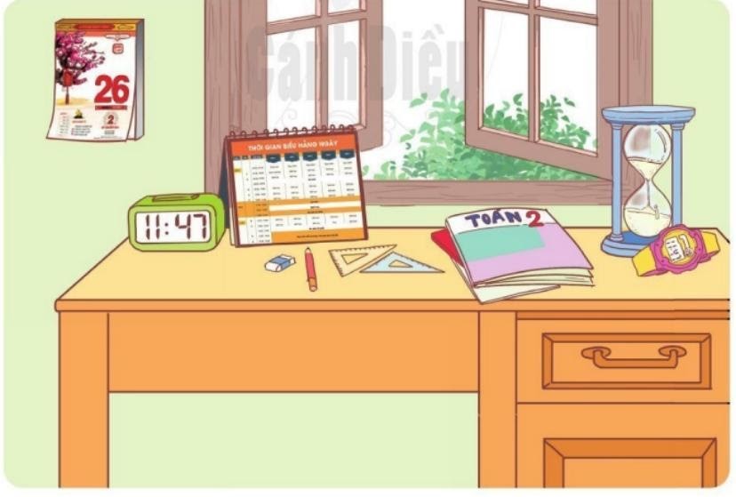 Các đồ vật chỉ thời gian trong tranh: lịch treo tường, đồng hồ, thời gian biểu, đồng hồ đeo tay, đồng hồ cát.