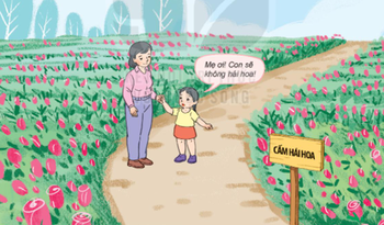 Bé vừa đánh vần vừa đọc. Bỗng em ôm chầm lấy mẹ thỏ thẻ: “Mẹ ơi, con không hái hoa nữa”.