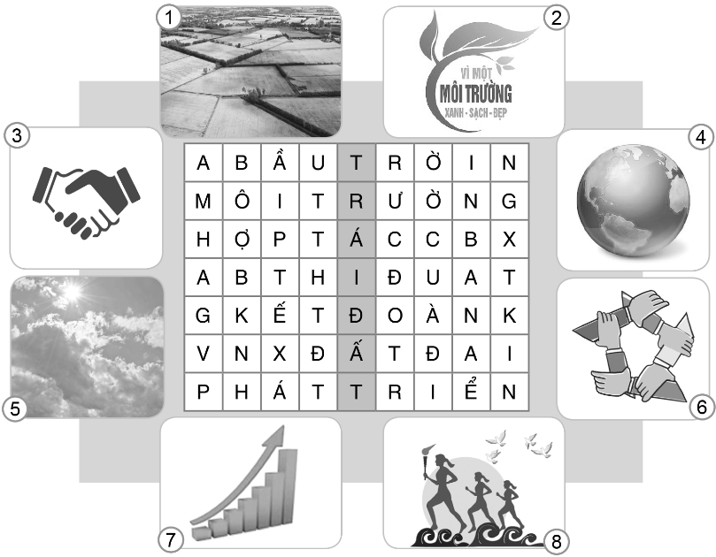 Ô chữ dưới đây có 8 từ, gồm 7 từ đọc theo hàng ngang và 1 từ đọc theo hàng dọc. Em hãy tìm các từ đó. Viết lại một từ em vừa tìm được ở ô chữ. Đánh số thứ tự trước từ đó theo số thứ tự của hình thích hợp ở bên cạnh ô chữ.