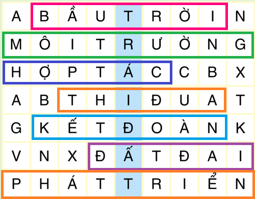 Ô chữ dưới đây có 8 từ, gồm 7 từ đọc theo hàng ngang và 1 từ đọc theo hàng dọc. Em hãy tìm các từ đó.