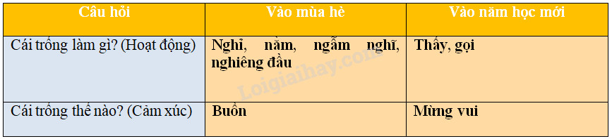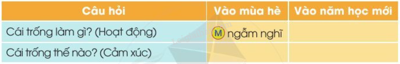 Câu 1: Hãy sắp xếp các từ chỉ hoạt động, cảm xúc của nhân vật “trống” vào ô thích hợp: