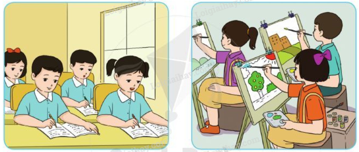 – Tranh 2: Các bạn đang vẽ tranh phong cảnh. Bạn nào cũng rất tập trung vào bức vẽ của mình.