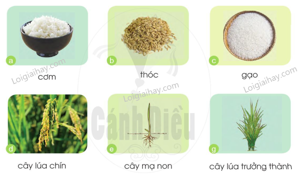 hứ tự các hình từ lúc lúa còn non đến lúc nấu thành cơm là: e – g – d – b – c – a