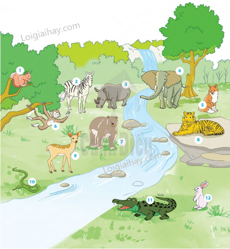 b. Con vật hiền, không nguy hiểm: sóc, ngựa vằn, voi, khỉ, gấu, nai, thỏ.