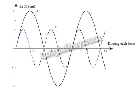 Sử dụng hệ toạ độ li độ – khoảng cách, hãy vẽ đồ thị của hai sóng C và D trong đó sóng C có biên độ và bước sóng gấp đôi biên độ và bước sóng của sóng D.