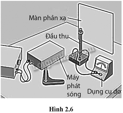 Một thí nghiệm khảo sát hiện tượng sóng dừng với sóng viba (loại sóng điện từ thường gặp ở lò vi sóng) được bố trí như Hình 2.6. Trong đó, đầu thu di chuyển từ từ trên một đường thẳng giữa máy phát sóng viba và màn phản xạ (được làm bằng kim loại) thì sẽ có những điểm thu được cường độ sóng cực đại và những điểm hầu như không ghi nhận có sóng.