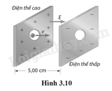 3.39. Trong các máy gia tốc hạt (cyclotron), các hạt tích điện được gia tốc giống như cách chúng được gia tốc trong các ống phóng điện tử, tức là thông qua một hiệu điện thế. Giả sử một proton được bơm với tốc độ ban đầu 1,00.106 m/s vào giữa hai bản phẳng cách nhau 5,00 cm (Hình 3.10). Sau đó, proton tăng tốc và thoát ra ngoài qua lỗ ở bản đối diện. Coi điện trường giữa hai bản là đều. Hướng x dương là hướng sang phải.