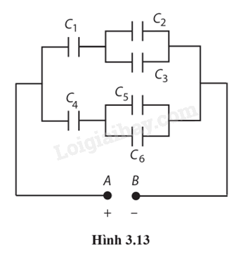 3.43. Bộ tụ điện ghép như Hình 3.13. Điện dung của các tụ điện có giá trị: C1 = 4,0 μF; C2 = 1,0 μF; C3 = 3,0 μF; C4 = 84,0 μF; C5 = 6,0 μF; C6 = 2,0 μF;