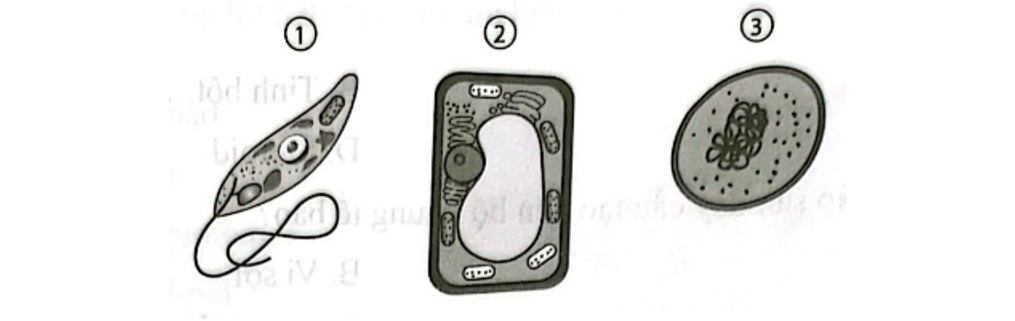 Quan sát hình sau đây và xác định mỗi tế bào từ 1 đến 3 thuộc loại tế bào nhân sơ hay tế bào nhân thực.