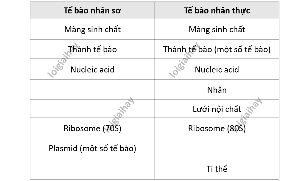 Hãy lập bảng và xếp chúng vào nhóm tế bào nhân sơ hay tế bào nhân thực tùy theo sự có mặt hay không của chúng ở các tế bào này. Ghi chú thành phần chỉ có ở một số tế bào trong hai nhóm này.