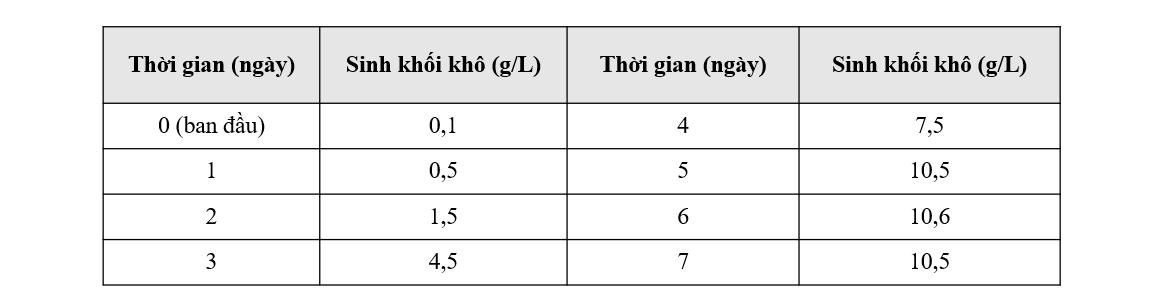 Do g = 0,5 (giờ) nên 6 giờ nuôi cấy tương đương 12 thế hệ phân chia → Mật độ vi khuẩn Bacillus subtillis trong dịch nuôi sau 6 giờ nuôi cấy là: 2.103.2.12 = 8,192.106 (tế bào/mL).