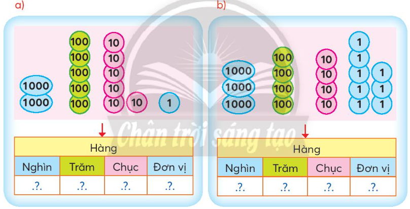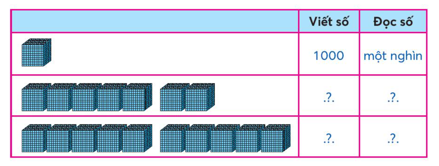 Viết và đọc các số tròn nghìn trong bảng dưới đây. Có mấy nghìn, mấy trăm, mấy chục và mấy đơn vị? Lấy các thẻ 1 000, 100, 10, 1 phù hợp với mỗi bảng sau.
