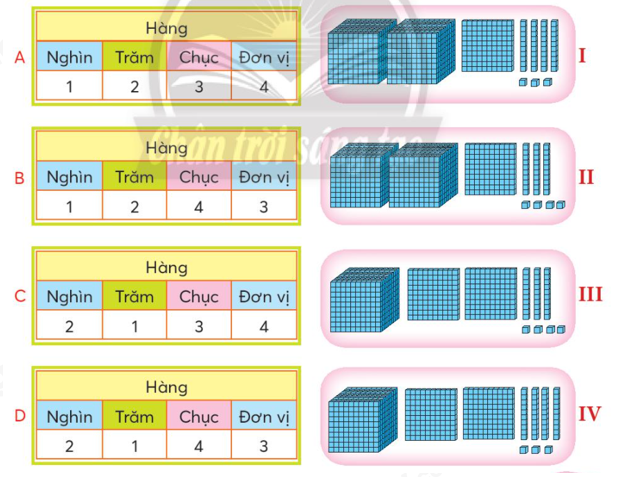 Lấy các thẻ 1 000, 100, 10, 1 phù hợp với mỗi bảng sau.