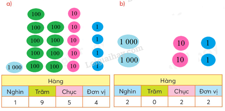 Đếm các thẻ số và cho biết có mấy nghìn, mấy trăm, mấy chục và mấy đơn vị.