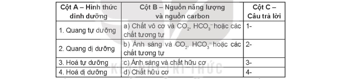 Dựa vào các kiểu dinh dưỡng của sinh vật, ta có kết quả nối như sau: