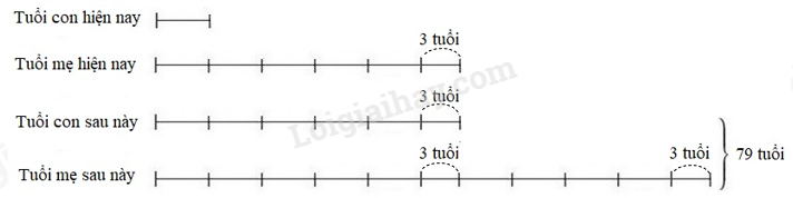 Ví dụ 5: Hiện nay tuổi mẹ hơn 5 lần tuổi con là 3 tuổi. Đến khi tuổi con bằng tuổi mẹ hiện nay thì tổng số tuổi của hai mẹ con bằng 79 tuổi. Tìm tuổi của mỗi người hiện nay.