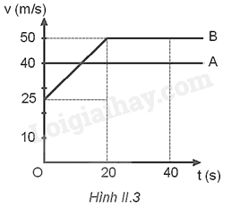 b) Gia tốc xe B: \({a_B} = \frac{{\Delta {v_B}}}{{\Delta t}} = \frac{{50 – 25}}{{20}} = 1,25m/{s^2}\)