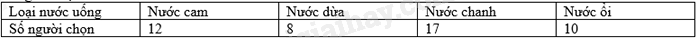 Câu 15: Một cửa hàng bán nước hoa quả đã khảo sát về loại nước mà khách hàng ưu chuộng và thu được bảng dữ liệu sau: