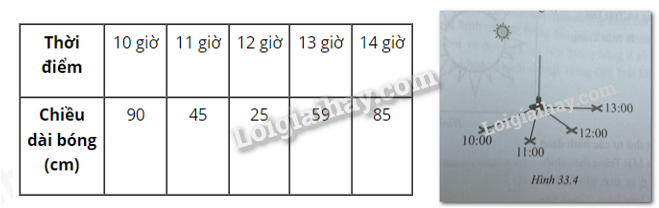 Em hãy nhận xét về sự thay đổi chiều dài in trên mặt đất của cái cọc trong khoản thời gian từ 10 giờ đến 14 giờ.