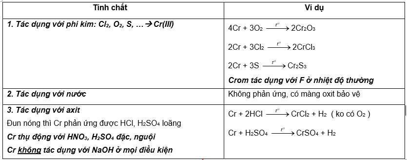 Tính khử Cr mạnh hơn Fe , yếu hơn kẽm (Cr có số oxi hóa +1 đến +6, thường gặp +2, +3, +6)