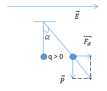 \(\tan \alpha  = \frac{{{F_d}}}{P} = \frac{{qE}}{{mg}} = \frac{{5,{{66.10}^{ – 7}}{{.10}^4}}}{{{{10}^{ – 3}}.9,79}} = 0,5781 \to \alpha  = {30^0}\)