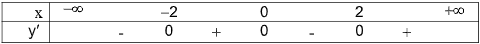 \(\begin{array}{l}y’ = {x^3} – 4x\\y’ = 0 \Rightarrow {x^3} – 4x = 0 \Leftrightarrow \left[ \begin{array}{l}x = 0\\x =  – 2\\x = 2\end{array} \right.\end{array}\)
