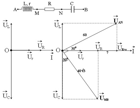 \(\begin{array}{l}{U_R} = 40\sqrt 3 \sin {30^0} = 20\sqrt 3 V\\{U_{R + r}} = 60\sin {60^0} = 30\sqrt 3 V \\\to {U_r} = 10\sqrt 3 V\\ \to r = \dfrac{{{U_r}}}{I} = 10\Omega \end{array}\)