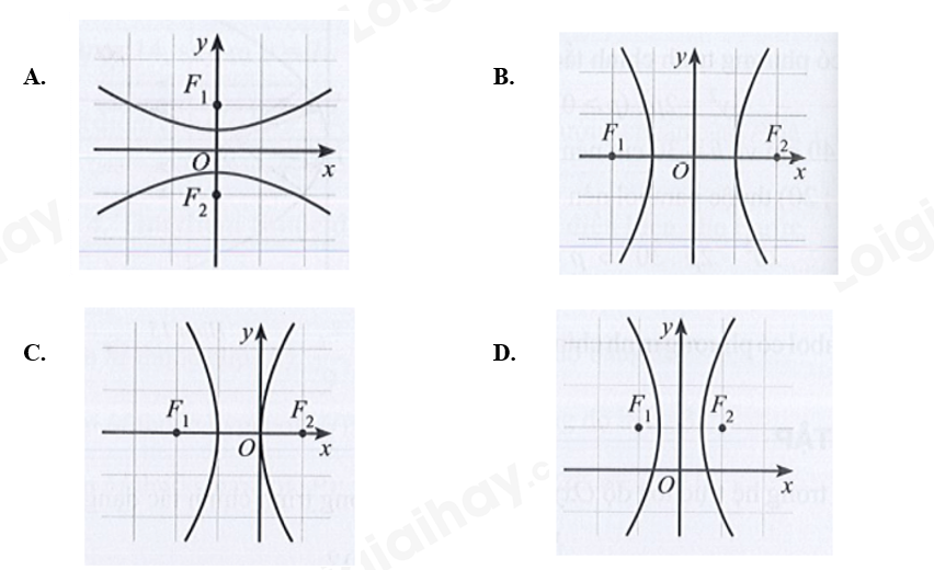 Dựa vào dáng điệu của hypebol \(\left( H \right):\frac{{{x^2}}}{{{a^2}}} – \frac{{{y^2}}}{{{b^2}}} = 1\)