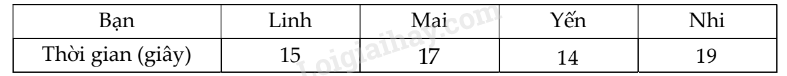 Câu 5. Dưới đây là bảng số liệu về thời gian mà bốn bạn Linh, Mai, Yến và Nhi khi tham gia chạy 100m.
