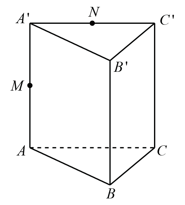 Câu 33: Cho lăng trụ tam giác \(ABC.A’B’C’\) có thể tích bằng \(V.\) Điểm \(M,\,\,N\) lần lượt là trung điểm của \(AA’,\,\,A’C’.\) Mặt phẳng \(\left( {BMN} \right)\) chia khối trụ thành hai khối đa diện. Thể tích khối đa diện chứa điểm \(A\) bằng