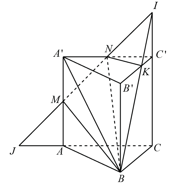Ta chia khối đa diện \(A’MBB’N\) thành hai khối chóp là: \(M.A’BN\) và \(B.A’NKB’.\)