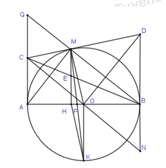 d) Qua O kẻ đường vuông góc với AB, cắt \(\left( O \right)\) tại K (K và M nằm khác phía với đường thẳng AB). Tìm vị trí của M để diện tích tam giác MHK lớn nhất.