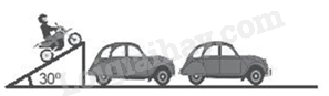 Một diễn viên biểu diễn mô tô bay đang phóng xe trên mặt dốc nằm nghiêng 30° để bay qua các ô tô như trong hình dưới. Biết vận tốc của xe mô tô khi rời khỏi đỉnh dốc là 14 m/s. Chiều cao của ô tô bằng chiều cao của dốc, chiều dài của ô tô là 3,2 m. Lấy g = 10 m/s2.